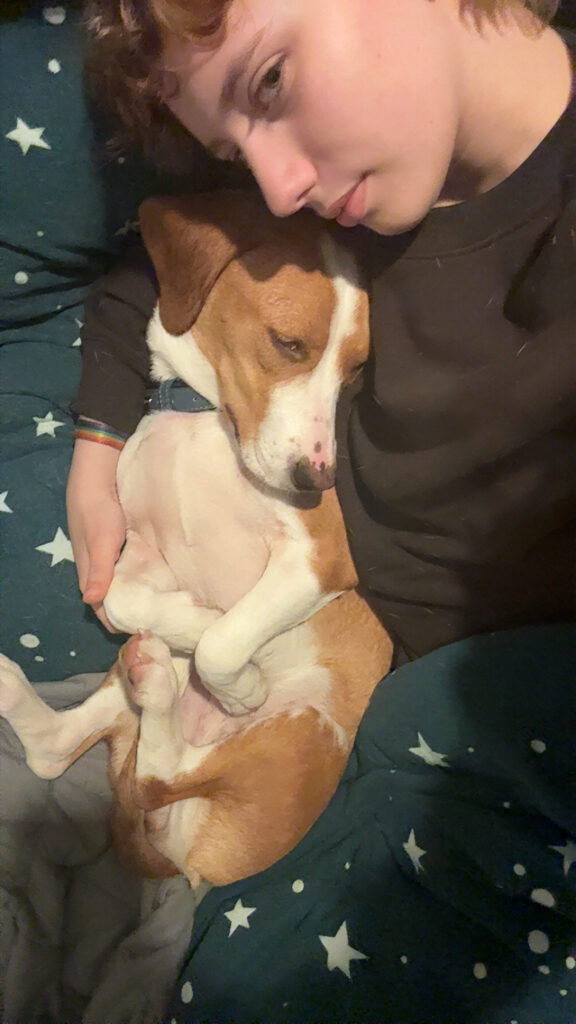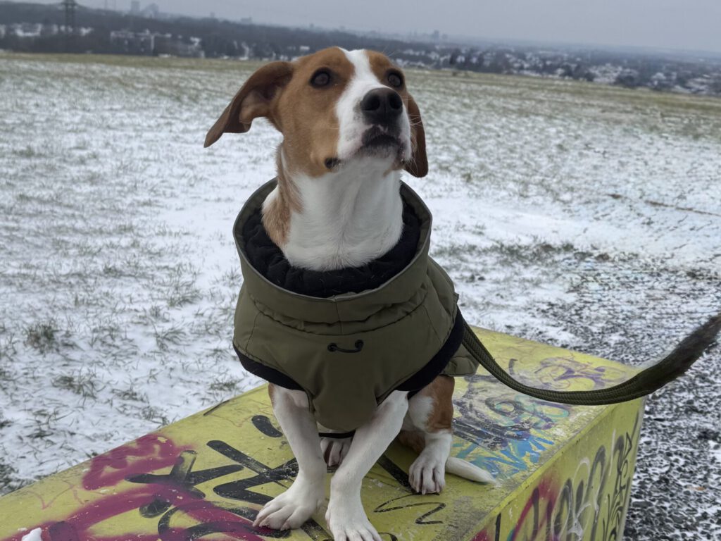 Es werden immer wieder einzelne Hunde raus genommen und sie kommen nicht zurück in den Transporter, sind wir etwa angekommen? Und jetzt bin ich dran, ich werde raus gehoben und mir wird ein Geschirr angelegt. Wo bin ich denn hier gelandet, so viele Menschen. Oh okay wir gehen durch die Tür dort. Und noch mehr Menschen WOW ICH WILL ALLEN HALLO SAGEN!!! Wer bist du? Und du? Und du? Oh Moment du bist besonders interessant! Bei dir gehe ich jetzt erst mal auf denn Schoß zum kuscheln, der auf dessen Schoß ich gerade bin heißt anscheinend Jamie und da ist auch seine Mama Sabine, die sind echt nett zu mir, bei denen möchte ich bleiben, die sind klasse. Das ist so schön hier alles um wahr zu sein… MOMENT habt ihr gerade etwas von für immer zuhause gesagt? Ihr nehmt mich mit? Ein echtes Zuhause für mich?